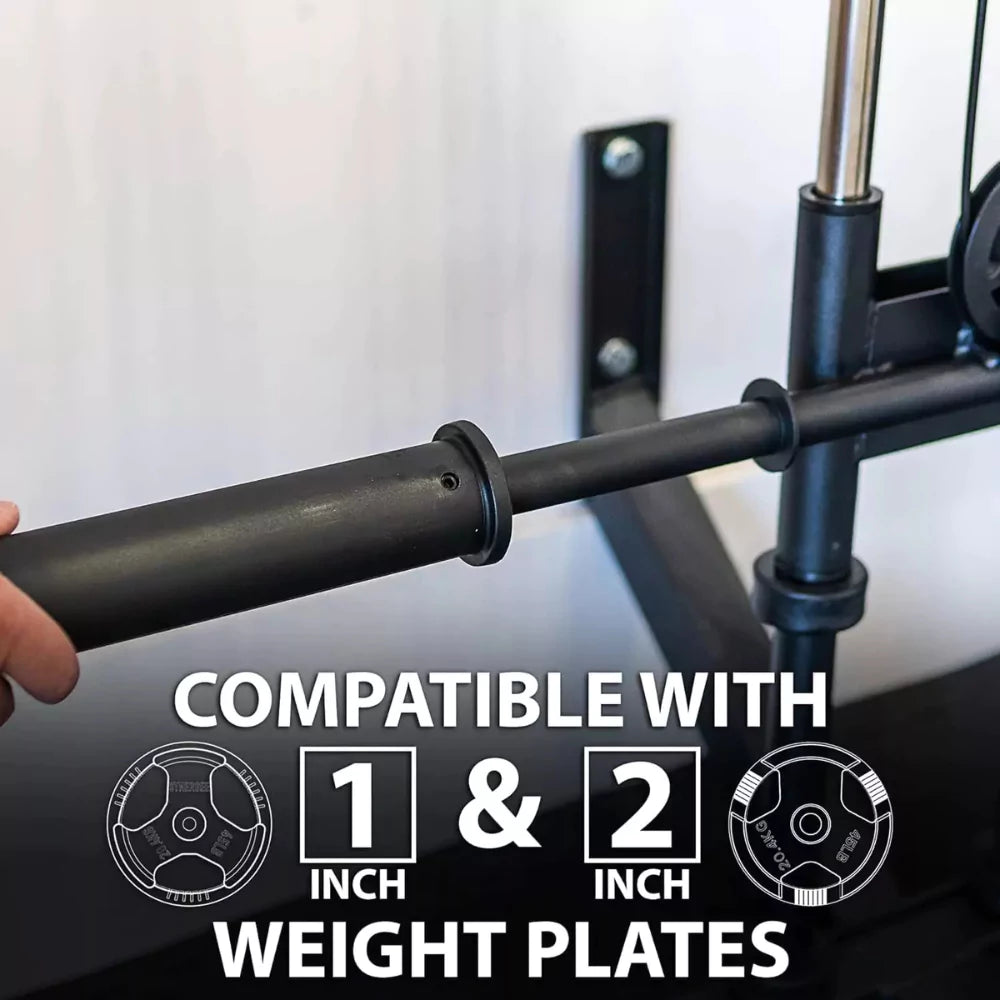 Its space-saving wall-mounted design makes it perfect for home or garage gyms in the UAE. The system features adjustable pulley height, smooth-glide pulleys, and multi-grip handle attachments, providing flexibility and versatility for upper body workouts. The weight plate loading bar can hold up to 200 kg, allowing progressive overload and muscle gain.